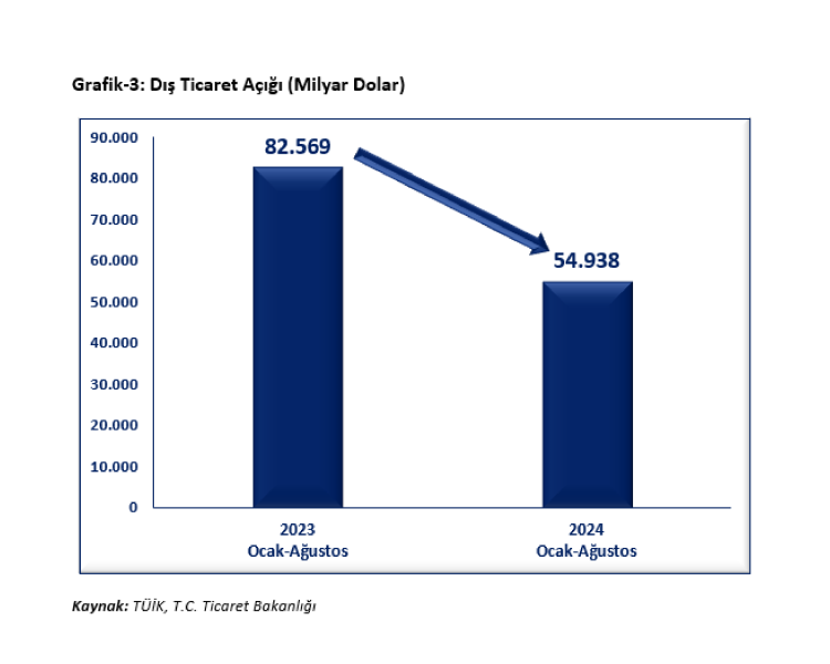 2024 yılı ilk 8 ayında ihracatımız bir önceki yılın aynı dönemine göre yüzde 3,9 oranında artarak 170,8 milyar dolar olduğunu kaydeden Bakan Bolat, “2024 Ağustos ayı itibari ile yıllıklandırılmış ihracatımız bir önceki yılın aynı ayına göre %3,5 artarak 262 milyar dolara ulaşmıştır. 2024 Ağustos ayında ithalat bir önceki yılın aynı ayına göre ,7 oranında azalarak 27,0 milyar dolar olurken, yılın ilk 8 ayında ithalat ise bir önceki yılın aynı dönemine göre %8,6 oranında düşerek 225,7 milyar dolar olmuştur. 2024 Ağustos ayında yıllıklandırılmış ithalatımız bir önceki yılın aynı ayına göre %8,3 oranında düşüşle 340,7 milyar dolara gerilemiştir. Böylelikle yılın ilk 8 ayında dış ticaret açığı %33,5 azalışla 54,9 milyar dolara gerilerken, ihracatın ithalatı karşılama oranı 9,1 puan artışla %75,7’ye yükselmiştir” diye konuştu.