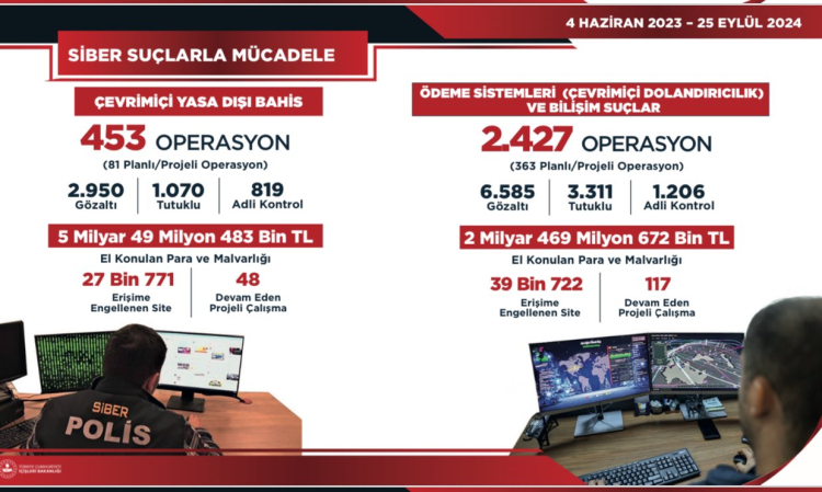 Bilişim suçları ve çevrimiçi yasa dışı bahisle mücadele kapsamında 4 ayda 2 bin 880 operasyon gerçekleştirilirken, 7,5 milyar lirayı aşkın paraya el konuldu.
