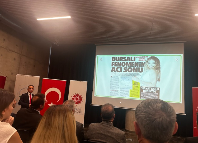 İletişim Başkanlığı Bursa Bölge Müdürü Ali Fuad Gölbaşı, “Doğru Habercilik ve Medya Etiği Bağlamında Bağımlılık ve İntihar Haberleri” konusu üzerine yaptığı sunumda, “İntihar ve bağımlılık pek çok ülkede artan bir grafik sergileyen, bireysel ve toplumsal iyilik halini ve toplum sağlığını yakından ilgilendiren bu yönüyle üzerinde önemle durulması gereken son derece hassas bir kamu sağlığı sorunudur. Bu konuda özellikle önleyici çalışmalara ihtiyaç vardır. Şeyh Edebali’nin 7 asır önce verdiği öğütle konuşmama başlamak isterim: İnsanı yaşat ki devlet yaşasın. Medya (kitle iletişim araçları) teknolojinin gelişimiyle insan yaşantısına hızlı bir giriş yaptı ve gündelik yaşamın önemli bir parçası halinde geldi. Medyanın insanların duyguları davranışları tutumları üzerindeki etkisinin büyüklüğü birçok araştırmanın konusudur. Bu meyanda bağımlılık ve intihar olgusuyla haber dili arasındaki ilişkinin incelenmesi hem dinamiklerin anlaşılması hem de önleyici tedbir açısından önem taşıyor. Biz bugün burada “Doğru Habercilik ve Medya Etiği Bağlamında Bağımlılık ve İntihar Haberleri” konulu bir farkındalık eğitimi gerçekleştirmek üzere bir araya gelmiş bulunmaktayız.” dedi.