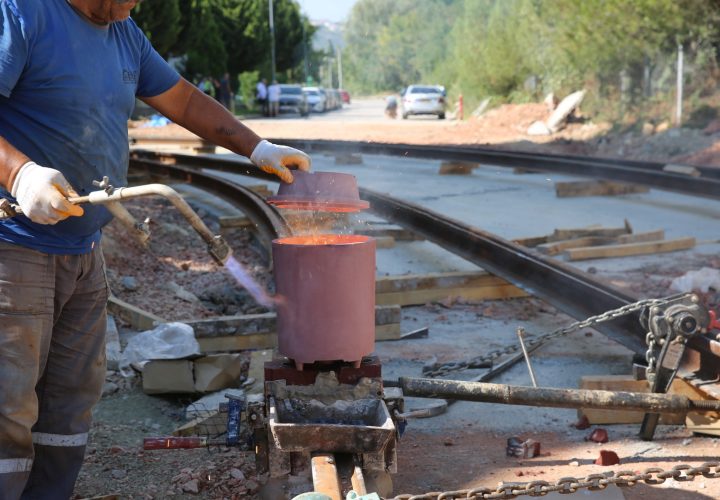 Toplam uzunluğu 3,8 km olan Alikahya Stadyum Tramvay Hattı projesinde altyapısı tamamlanan projede rayların kaynakları yapılmaya başlandı...