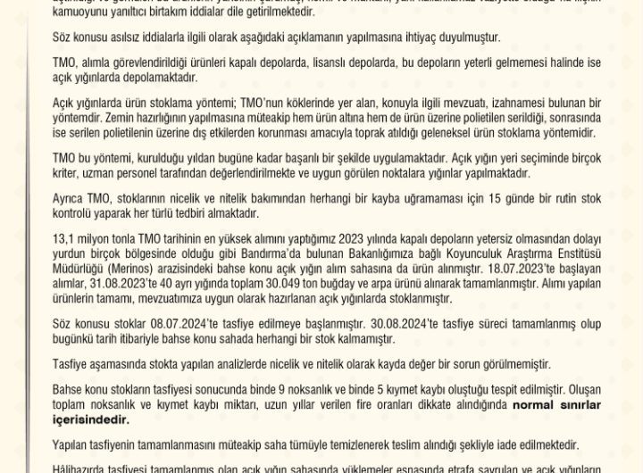 Toprak Mahsulleri Ofisi (TMO), açık yığınlarda ürün stoklama uygulamasına yönelik son dönemlerde ortaya atılan ürünlerin çürütüldüğüne yönelik...