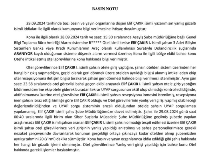 Karar Gazetesi yazarı Elif Çakır’ın Bursa’da kaldığı otelde hakkında arama kararı olduğu gerekçesiyle gözaltına alındığı iddiaları üzerine...
