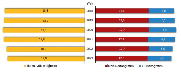 İlkokula başlama çağındaki bir bireyin en yüksek eğitim kademesini tamamlayana kadar eğitim hayatında geçirmesi muhtemel süre bir önceki yıla göre toplamda yüzde 1,3’lük düşüş gösterdi. 2021 yılından itibaren görülen bu düşüş erkeklerde kadınlara oranla daha hızlı seyretti. MES, erkeklerde 2022 yılına göre yüzde 2,8’lik düşüş ile 17,6 yıl olurken, kadınlarda yüzde 0,3’lük artış ile 18,4 yıl oldu.
