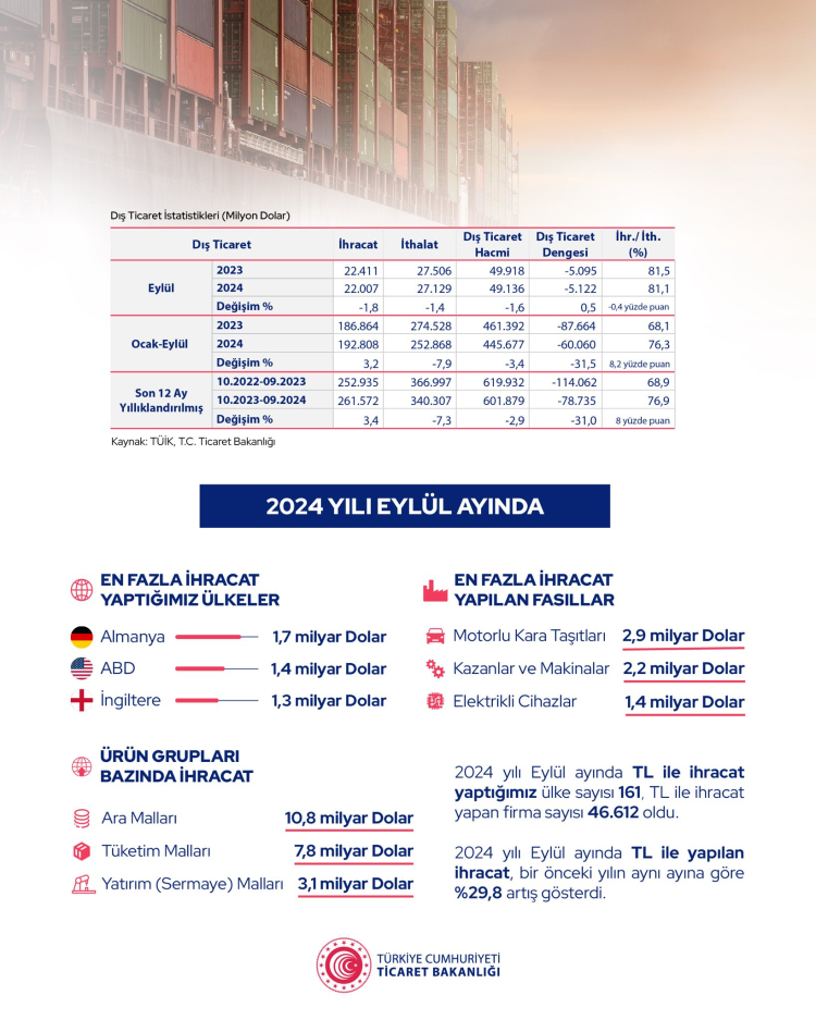 2024 yılı Eylül ayında TL ile ihracat yapılan ülke sayısı 161, ihracat yapan firma sayısı ise 46 bin 612 olurken; TL ile yapılan ihracat bir önceki yılın aynı ayına göre yüzde 29,8 artış gösterdi.