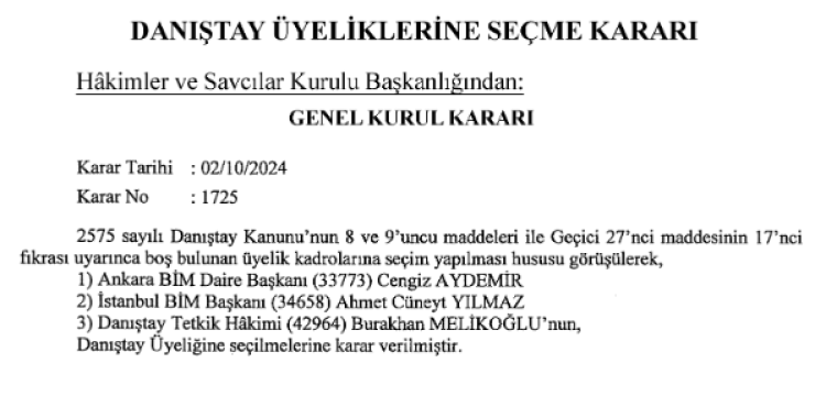 Bu arada İstanbul Bölge İdare Mahkemesi Başkanı Ahmet Cüneyt Yılmaz, Danıştay Tetkik Hakimi Burakhan Melikoğlu ve Ankara Bölge İdare Mahkemesi Başkanı Cengiz Aydemir ise Danıştay üyesi oldu.