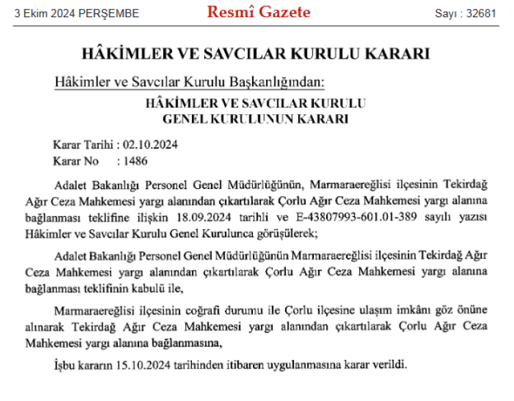 Öte yandan HSK Genel Kurulunca, Adalet Bakanlığı Personel Genel Müdürlüğünün teklifiyle, Marmaraereğlisi ilçesinin Tekirdağ Ağır Ceza Mahkemesi yargı alanından çıkarılarak Çorlu Ağır Ceza Mahkemesi yargı alanına bağlanmasına karar verildi.