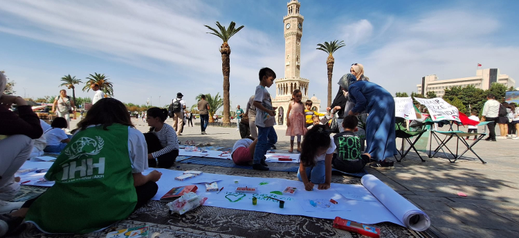 Yetim Vakfı İzmir İl Koordinatörlüğü’nün IHH İzmir Şubesi’den de destek alarak Konak Meydanı Saat Kulesi önünde düzenlediği etkinliğe aileleri ile birlikte katılan İzmirli çocuklar İsrail’in Gazze ve Filistin’de yaşattığı zulmü resmederek farkındalık oluşturmaya çalıştı.