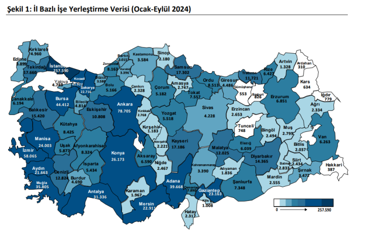 2024 yılının 9 ayında 1 milyon 80 bin 189 vatandaşın işe yerleştirilmesine aracılık eden İŞKUR, il bazlı işe yerleştirme verilerini de paylaştı. İŞKUR, 9 aylık sürede en çok İstanbul, Ankara ve İzmir’de işe yerleştirmeye aracılık etti.
