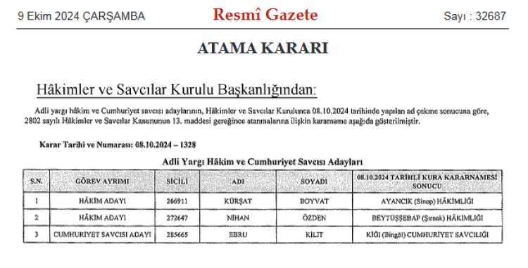 Atama kararına göre; hakim adayı Kürşat Boyvat Sinop Ayancık Hakimliği’ne, hakim adayı Nihan Özden Şırnak Beytüşşebap Hakimliği’ne ve Cumhuriyet Savcısı adayı Ebru Kilit ise Bingöl Kiğı Cumhuriyet Savcılığı’na atandı.