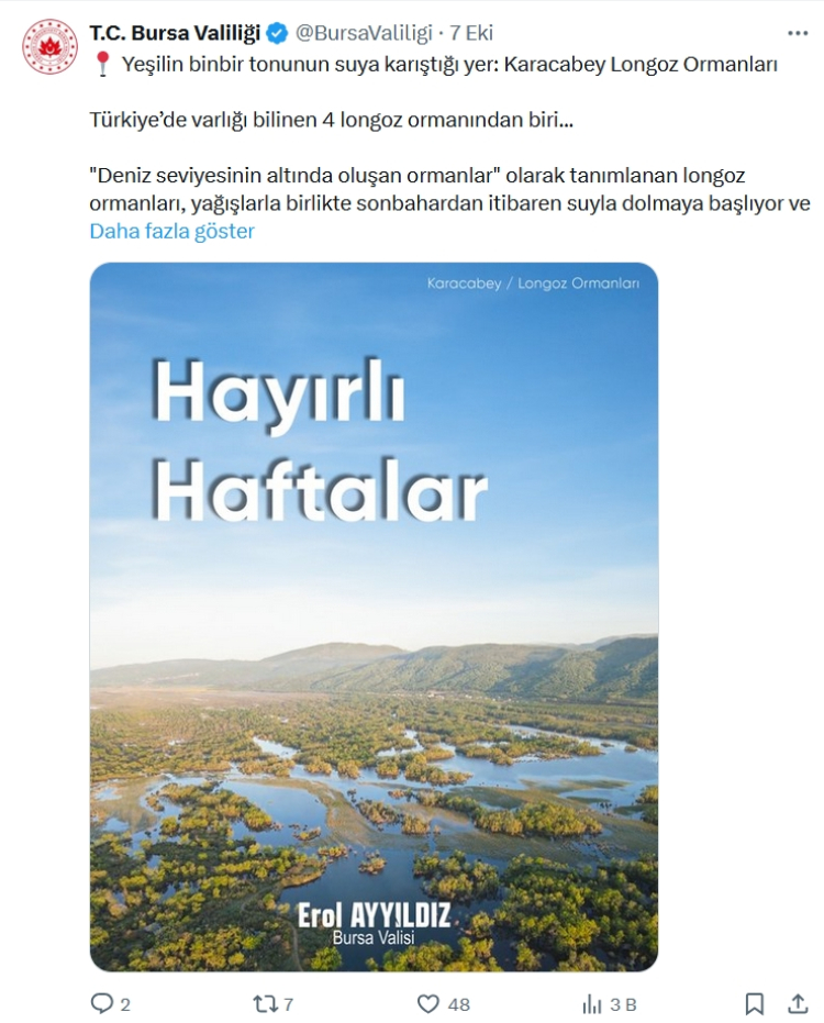 Bursa Valisi Erol Ayyıldız, valiliğin sosyal medya hesaplarından hafta başında Karacabey Longoz Ormanı ile ilgili bir paylaşım yaptı.