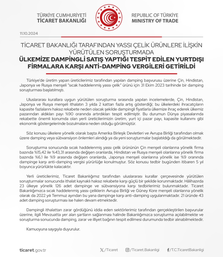Türkiye’de üretim yapan üreticiler tarafından yapılan damping başvurusu üzerine Çin, Hindistan, Japonya ve Rusya menşeli sıcak haddelenmiş yassı çelik ürünü için 31 Ekim 2023 tarihinde damping soruşturması başlatıldığı anımsatıldı.