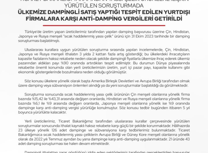 Ticaret Bakanlığı tarafından yassı çelik ürünlere ilişkin yürütülen soruşturmada Türkiye’ye dampingli satış yaptığı belirlenen yurtdışı firmalara karşı...