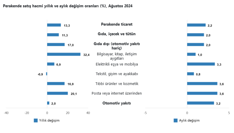 Ticaret satış hacmi (2021=100) 2024 yılı Ağustos ayında bir önceki yılın aynı ayına göre yüzde 5,3 arttı. Aynı ayda motorlu kara taşıtlarının ve motosikletlerin toptan ve perakende ticareti ile onarımı için satış hacmi yüzde 1,0 azaldı, toptan ticaret satış hacmi yüzde 3,1 arttı, perakende ticaret satış hacmi ise yüzde 13,3 arttı.