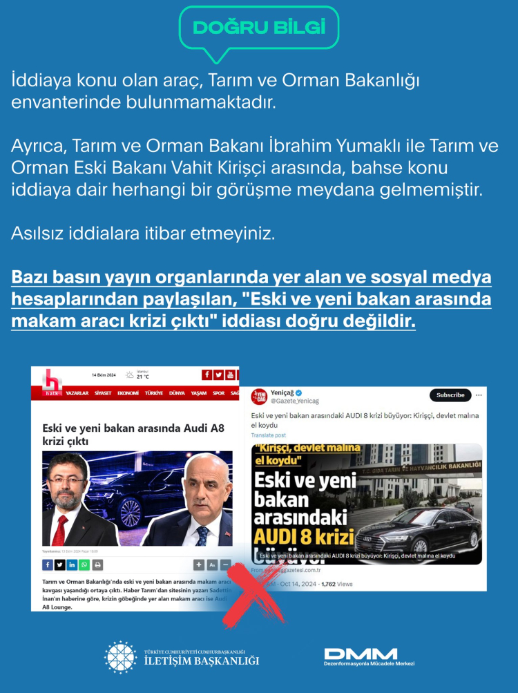 İletişim Başkanlığı, bazı basın yayın organlarında ve sosyal medya hesaplarında yer alan, “Eski ve yeni bakan arasında makam aracı krizi çıktı” iddiasının doğru olmadığını açıkladı.