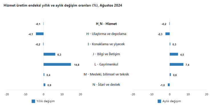 Hizmet üretim endeksi yıllık ve aylık bazda azalış kaydederken, gayrimenkul aylık ve yıllık bazda en yüksek değişim gösteren hizmet olarak öne çıktı.