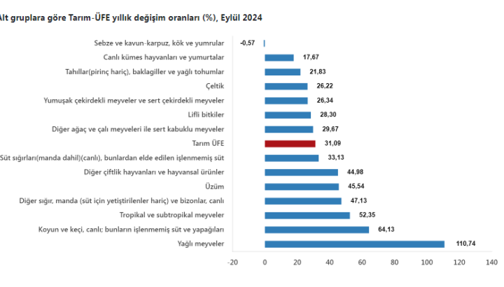 Tarım ürünleri üretici fiyat endeksi (Tarım-ÜFE) yıllık yüzde 31,09, aylık ise yüzde 2,00 arttı. Alt gruplara bakıldığında...