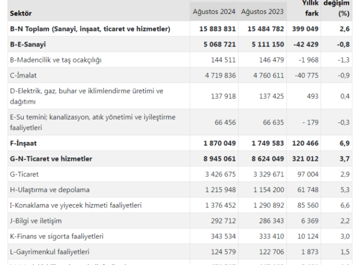 Ücretli çalışan sayısı yıllık yüzde 2,6 artarken; sanayi, inşaat ve ticaret-hizmet sektörleri toplamında aylık bazda ücretli çalışan...