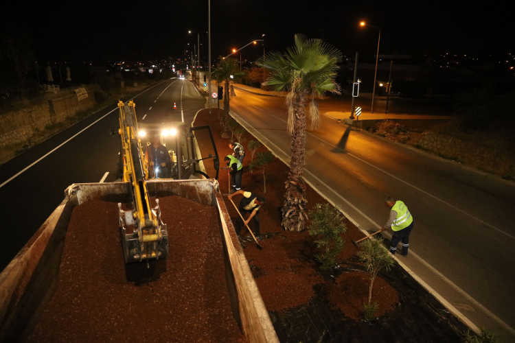 Güzelbahçe Belediyesi Park Bahçeler Müdürlüğü 7 kilometrelik Seferihisar orta refüj çalışmasını gece mesaisinde de yapmaya devam ediyor.