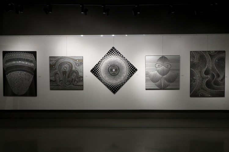Aşoğlu’nun geometrik ve asimetrik formlar, tekrar eden, büyüyüp küçülen desenlerden oluşan eserleri, sanatçılar uzun süre baktığında ezoterik simgelere dönüşüyor.