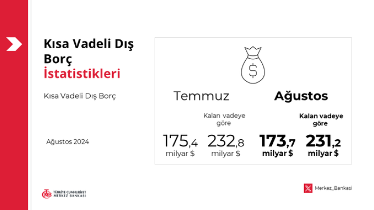 2024 Ağustos sonu itibarıyla, orijinal vadesine bakılmaksızın vadesine 1 yıl veya daha az kalmış dış borç verisi kullanılarak hesaplanan kalan vadeye göre kısa vadeli dış borç stoku, 231,2 milyar ABD doları düzeyinde gerçekleşmiştir. Söz konusu stokun 21,3 milyar ABD dolarlık kısmı, Türkiye’de yerleşik bankaların ve özel sektörün yurt dışı şubeleri ile iştiraklere olan borçlarından oluşmaktadır. Borçlu bazında değerlendirildiğinde, toplam stok içinde kamu sektörünün yüzde 24,1, Merkez Bankası’nın yüzde 16,5, özel sektörün ise yüzde 59,4 oranında paya sahip olduğu gözlendi.