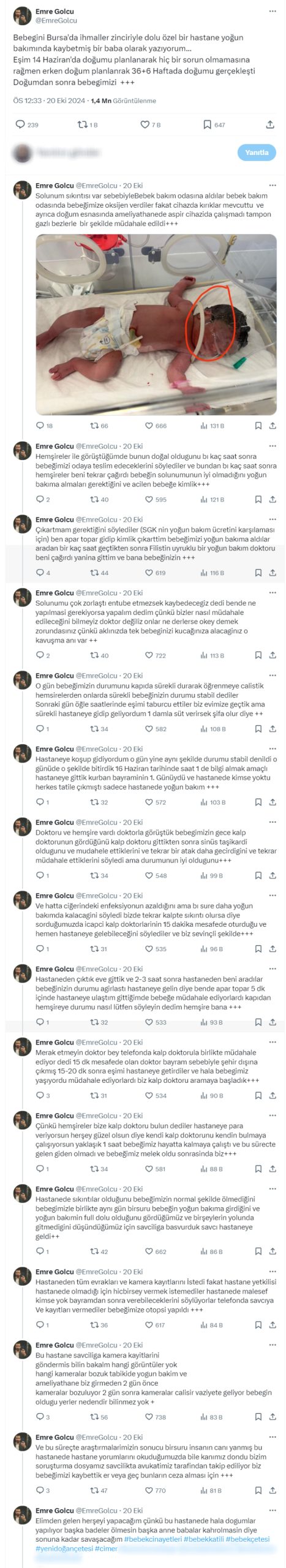 “Bebeğimi Bursa’da ihmaller zinciriyle dolu özel bir hastanede kaybetmiş bir baba olarak yazıyorum. Eşimin doğumu 36+6 haftada planlı bir şekilde gerçekleşti.”