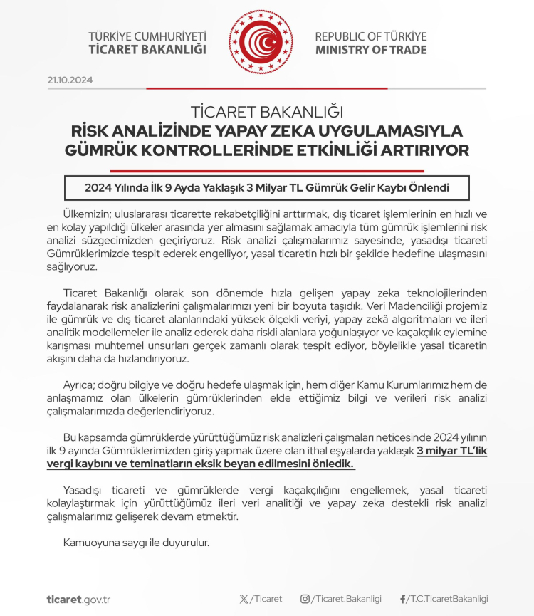Ticaret Bakanlığı, risk analizinde yapay zeka uygulamasıyla gümrük kontrollerinde etkinliği artırıyor. 2024 yılında ilk 9 ayda yaklaşık 3 milyar lira gümrük gelir kaybı önlendi.
