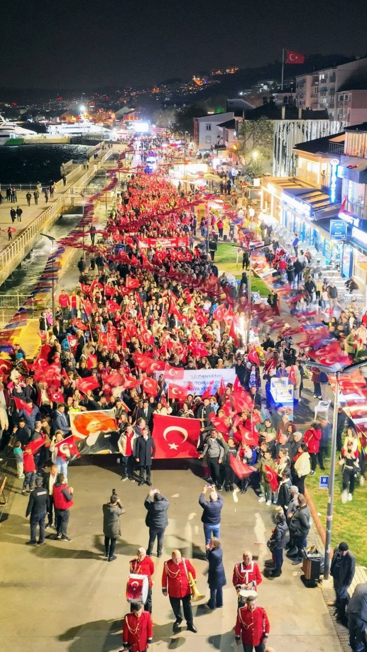 Bursa’nın Mudanya ilçesinde Cumhuriyet ruhunun yaşatıldığı saat 19:23 Yürüyüşü ile Mudanyalılar, Cumhuriyet Meydanı’ndan Mütareke Meydanı’na adımlarını 101 yıl önceki aynı heyecanla attı.