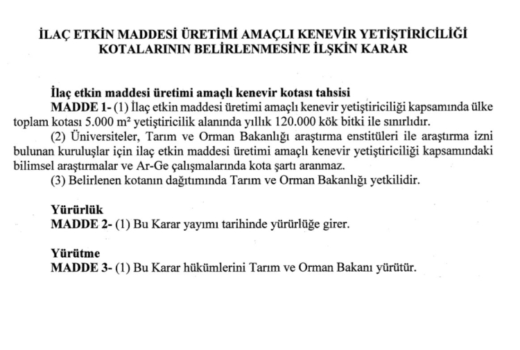 Kararda; üniversiteler, Tarım ve Orman Bakanlığı araştırma enstitüleri ile araştırma izni bulunan kuruluşlar için ilaç etkin maddesi üretimi amaçlı kenevir yetiştiriciliği kapsamındaki bilimsel araştırmalar ve AR-GE çalışmalarında kota şartı aranmayacağı belirtilirken, kotanın dağıtımıyla ilgili Tarım ve Orman Bakanlığı yetkili olduğu kaydedildi.