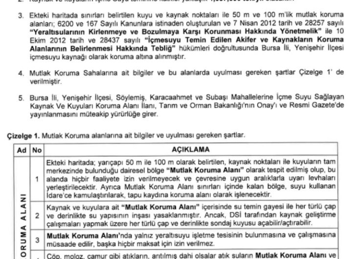 Bursa’nın Yenişehir ilçesine bağlı Subaşı, Söylemiş ve Karacaahmet mahallelerine içme suyu sağlayan kaynak ve kuyular koruma alanı...