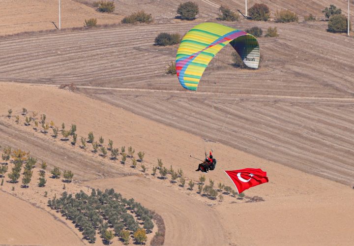 Bilecik’in Gölpazarı ilçesindeki Meryem Dağı, 29 Ekim Cumhuriyet Bayramı kutlamaları kapsamında bugün gökyüzünde adeta kırmızı-beyaz bir şölen...