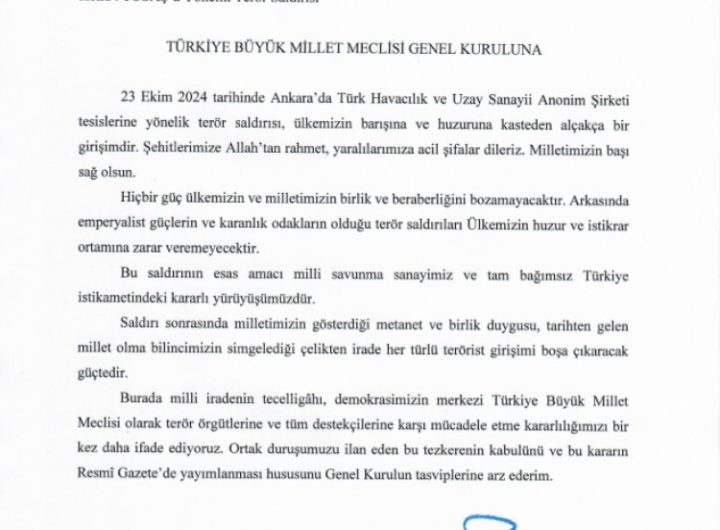 Türkiye Büyük Millet Meclisi Başkanlığının TUSAŞ’a yönelik alçak terör saldırısına karşı tezkeresi kabul edildi. ANKARA (İGFA) –...