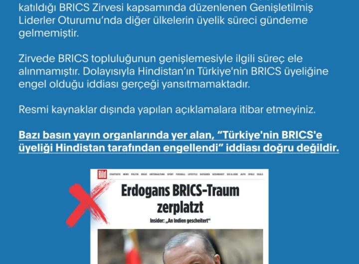 Bazı basın yayın organlarında yer alan “Türkiye’nin BRICS’e üyeliği Hindistan tarafından engellendi” iddiasının doğru olmadığı açıklandı. ANKARA...