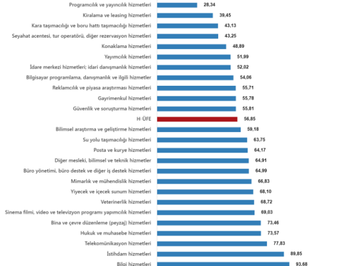 Hizmet Üretici Fiyat Endeksi (H-ÜFE) yıllık yüzde 56,85 arttı, aylık yüzde 1,14 arttı. Sektörlere göre H-ÜFE yıllık...