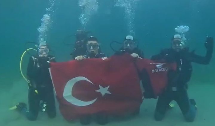 Bursa’da arama kurtarma gönüllüsü öğretmenler, Marmara Denizi derinliklerine dalarak Türk bayrağı açtı. İlker TÜRKER / HERKES DUYSUN...
