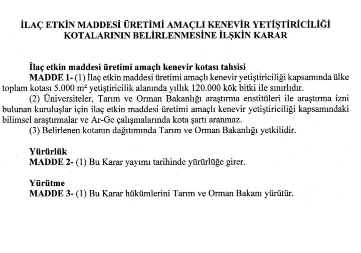 Türkiye’de ilaç etkin maddesi üretimi amaçlı kenevir yetiştiriciliği kotalarının belirlenmesine yönelik karar bugünkü Resmi Gazete’de yayımlandı. ANKARA...