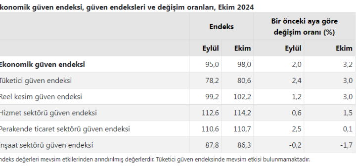 TÜİK’in açıkladığı Ekim ayına ilişkin Ekonomik Güven Endeksi, bir önceki aya göre yüzde 3,2 oranında artarak 98...