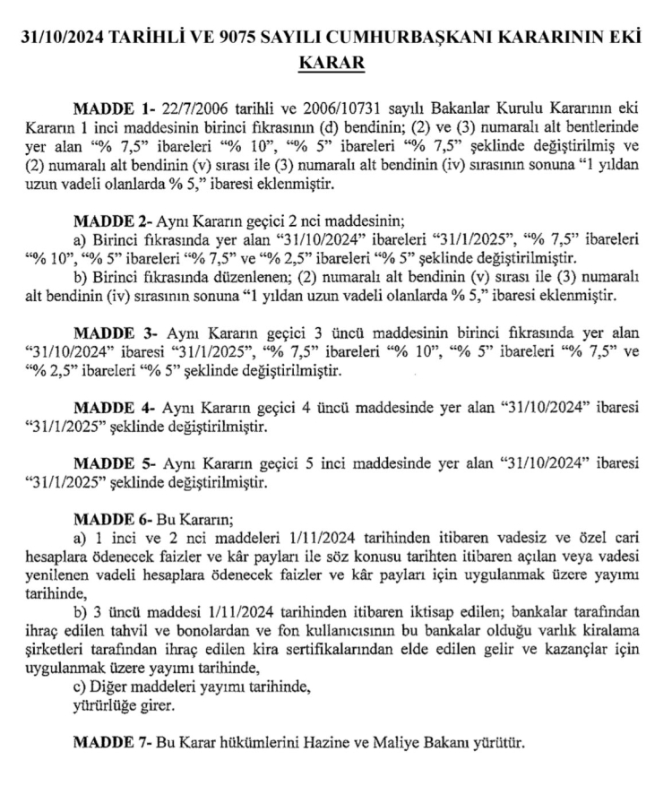 Son tarih 31 Ocak 2025 olmak üzere daha önce 6 ay vadeli mevduatta yüzde 7,5 olan stopaj yüzde 10’a, 1 yıl vadeli olanlarda ise yüzde 5’ten yüzde 7,5’e çıkarıldı.
