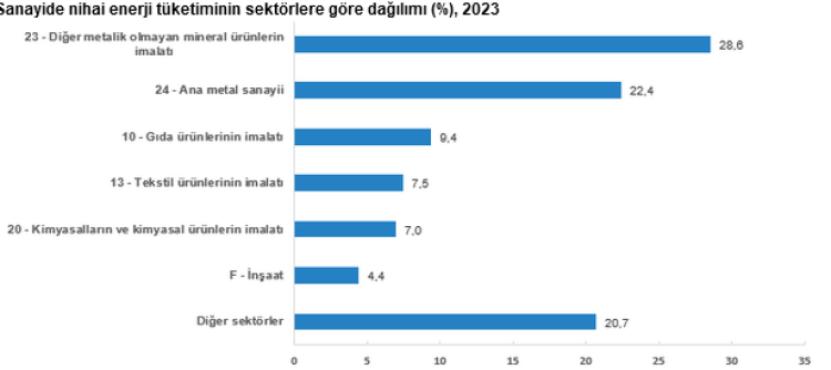 (TÜİK) verilerine göre Sanayi Sektörü Nihai Enerji Tüketim Araştırması sonuçlarına göre; sanayi sektöründe 2023 yılında toplam nihai enerji tüketimi 1 milyon 706 bin 480 terajul oldu. Alt sektörler itibariyle nihai enerji tüketiminde en büyük payı, yüzde 28,6 ile “diğer metalik olmayan mineral ürünlerin imalatı” sektörü aldı.