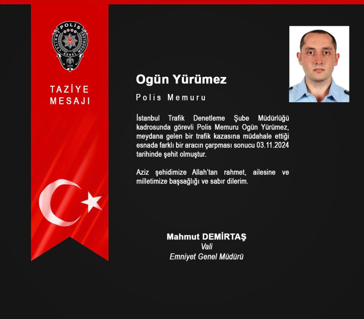 Alınan bilgiye göre İstanbul Trafik Denetleme Şube Müdürlüğü’nde görevli Polis Memuru Ogün Yürümez, Bakırköy’de meydana gelen trafik kazasına müdahale esnasında İETT otobüsünün çarpması sonucu olay yerinde şehit oldu.