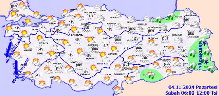Yağışların; genellikle yağmur ve sağanak, Rize, Artvin, Bitlis, Van ve Hakkari’nin yüksek kesimlerinde karla karışık yağmur ve kar şeklinde olması bekleniyor. Sabah ve gece saatlerinde kuzey ve iç kesimlerde pus ve yer yer sis bekleniyor.