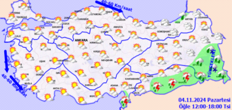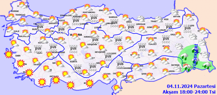 ANKARA (İGFA) – Meteoroloji Genel Müdürlüğü 4 Kasım Pazartesi gününe ilişkin günlük hava tahmin raporunu yayınladı. Meteoroloji Genel Müdürlüğü tarafından yapılan son tahminlere göre,ülkemiz genelinin parçalı yer yer çok bulutlu, Batı Karadeniz kıyıları, Doğu Anadolu’nun güneydoğusu, Güneydoğu Anadolu’nun doğusu ile Hatay, Samsun, Rize ve Artvin çevrelerinin yağışlı geçeceği tahmin ediliyor.