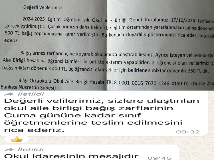 “2024-2025 Eğitim Öğretim yılı okul aile birliği genel kurulu tarafından alınan karar ile çocukların daha kaliteli eğitim ortamından yararlanmaları adına dönemlik 500 TL bağış toplanmasına karar verilmiştir” denilen yazıda, paranın hem zarf içine konulabileceği, hemde verilen bir IBAN’a yatırılabileceği belirtildi.