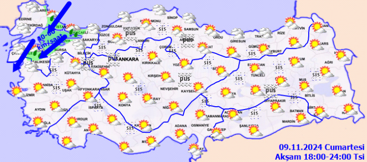 Yapılan son tahminlere göre Türkiye’nin kuzey ve iç kesimlerinin parçalı ve yer yer çok bulutlu, İstanbul, Kocaeli ve Yalova çevreleri ile Kırklareli’nin kıyı, Balıkesir’in kuzey kesimlerinin yağmur ve sağanak yağışlı, diğer yerlerin az bulutlu ve açık geçeceği tahmin ediliyor. Kuzey ve iç kesimlerde pus ve yer yer sis hadisesi görülmesi bekleniyor.