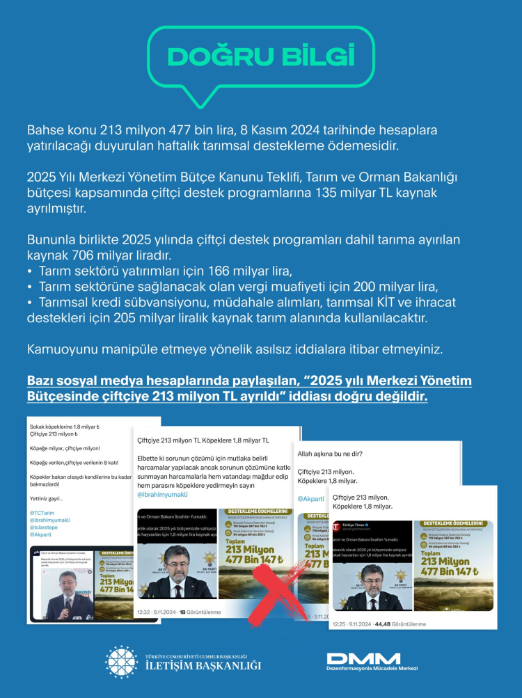Dezenformasyonla Mücadele Merkezi’nden yapılan açıklamada, bazı sosyal medya hesaplarında paylaşılan, “2025 yılı Merkezi Yönetim Bütçesinde çiftçiye 213 milyon TL ayrıldı” iddiası doğru olmadığının altı çizildi.