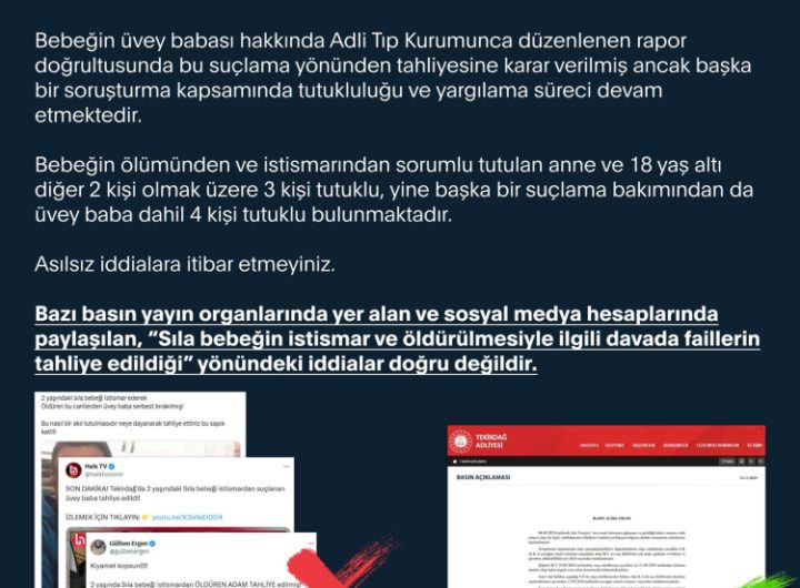 Bazı basın yayın organlarında yer alan ve sosyal medya hesaplarında paylaşılan “Sıla bebeğin istismar ve öldürülmesiyle ilgili...