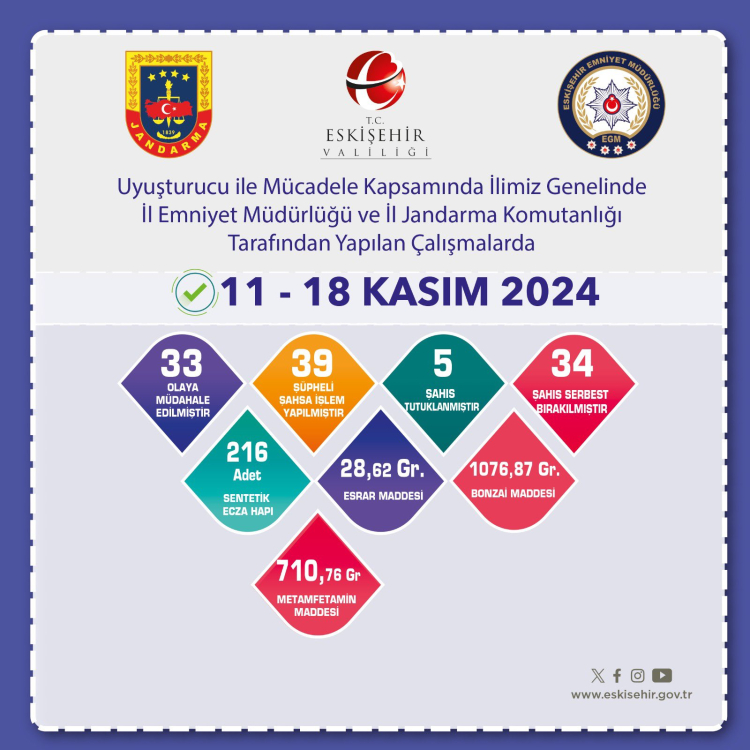 ESKİŞEHİR (İGFA) – Eskişehir Valiliği, uyuşturucu ile mücadele konusunda 11 ile 18 Kasım 2024 tarihleri arasında il genelinde emniyet ve jandarma ekiplerince yapılan faaliyetlere ilişkin bilgilendirmede bulundu.