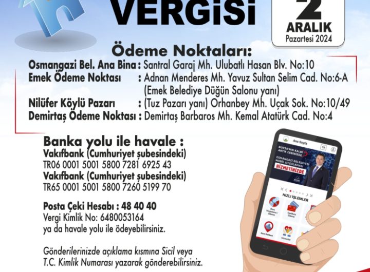 Osmangazi Belediyesi, 2 Aralık tarihinde sona erecek olan Emlak Vergisi’nin 2. taksitini ödemek isteyen vatandaşlara, Osmangazi Belediyesi...