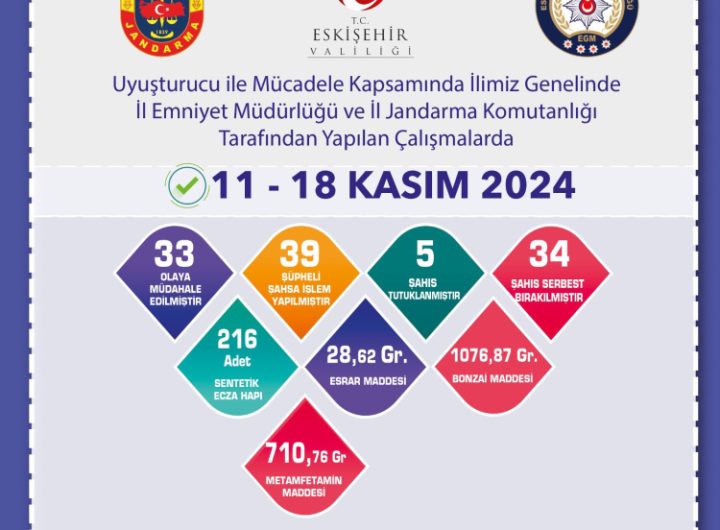 Eskişehir’de uyuşturucu ile mücadele kapsamıda İl Emniyet ve Jandarma Komutanlığı tarafından yapılan çalışmalara ilişkin haftalık özet yayımlandı....