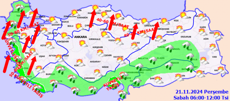 Buna göre yağışların, Marmara, Kıyı Ege, Batı Akdeniz, Adana, Düzce, Zonguldak, Bolu ve Bartın çevrelerinde kuvvetli, İzmir, Aydın, Muğla çevreleri ile Antalya’nın doğu kesimlerinde yer yer çok kuvvetli olması beklendiğinden; güney ve güneybatı, öğle saatlerinden itibaren kuzeybatı kesimlerde kuzey ve kuzeybatı yönlerden İç Anadolu ve Karadeniz’de kuvvetli (40-60 km/saat), Marmara ve Ege’de kuvvetli ve fırtına (50-80 km/saat) şeklinde esmesi beklendiğinden yaşanabilecek olumsuzluklara karşı dikkatli ve tedbirli olunması istendi.