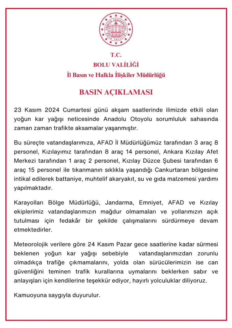 Bolu Valiliği, yaşanan yoğun kar yağışı neticesinde Cankurtaran mevkiinde kış lastiği olmayan taşıtlardan kaynaklı trafikte meydana gelen kısa süreli aksamalar sebebiyle yolda beklemek zorunda kalan sürücü ve vatandaşlara Valilik koordinesinde AFAD, Kızılay ve ilgili kuruluşlar tarafından yakıt, kumanya, su ve battaniye dağıtımı yapıldığını bildirdi.